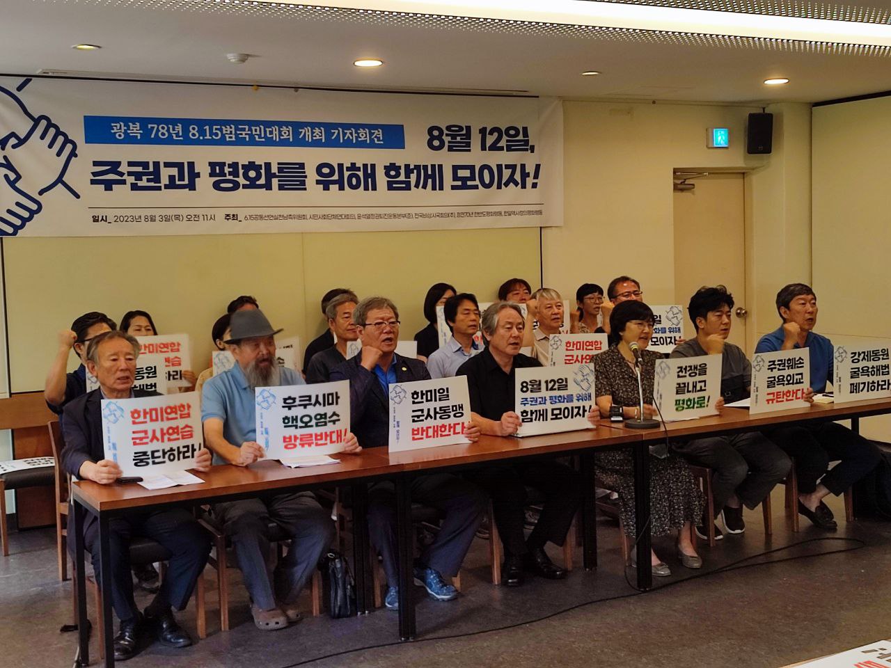 6·15공동선언실천 남측위원회, 시민사회단체연대회의, 정전70년한반도평화행동, 한일역사정의평화행동 등은 이날 오전 서울 중구 프란치스코교육회관에서 ‘광복 78년 8·15범국민대회 개최 기자회견’을 열어 “윤석열 정부의 남북대결, 대일굴욕, 대미편향 외교로 주권과 평화가 심각히 훼손되고 있다”며 “8·15광복절을 전후로 다시 최대 규모의 한·미연합군사연습이 시작되고, 한·미·일 정상회담을 통해 군사동맹 구축이 본격화될 것으로 알려져, 주권과 평화를 지키기 위한 시민의 힘이 절실한 때”라고 주장했다. 이들은 오는 12일 수만명이 참여하는 범국민대회를 서울에서 개최할 계획이라고 밝혔다.이어 “윤석열 정부는 마치 일본과의 군사협력, 한·미·일 군사협력만이 우리의 안보를 지켜줄 것처럼 주권을 훼손하는 굴욕적인 외교 행보를 이어가고 있다”며 “한반도에는 팽팽한 군사적 대결과 위기가 재현되고 있다”고 주장했다.