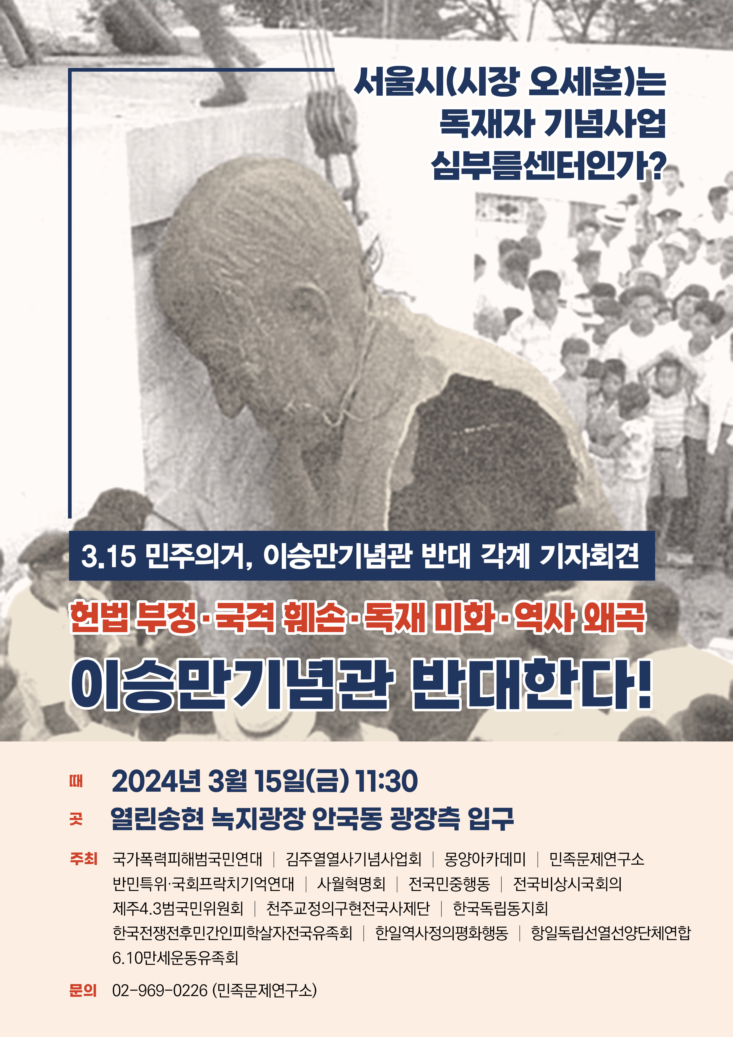 | 헌법 부정, 국격 훼손, 독재 미화, 역사 왜곡 이승만기념관 반대한다! (0) | 2024.03.27 |