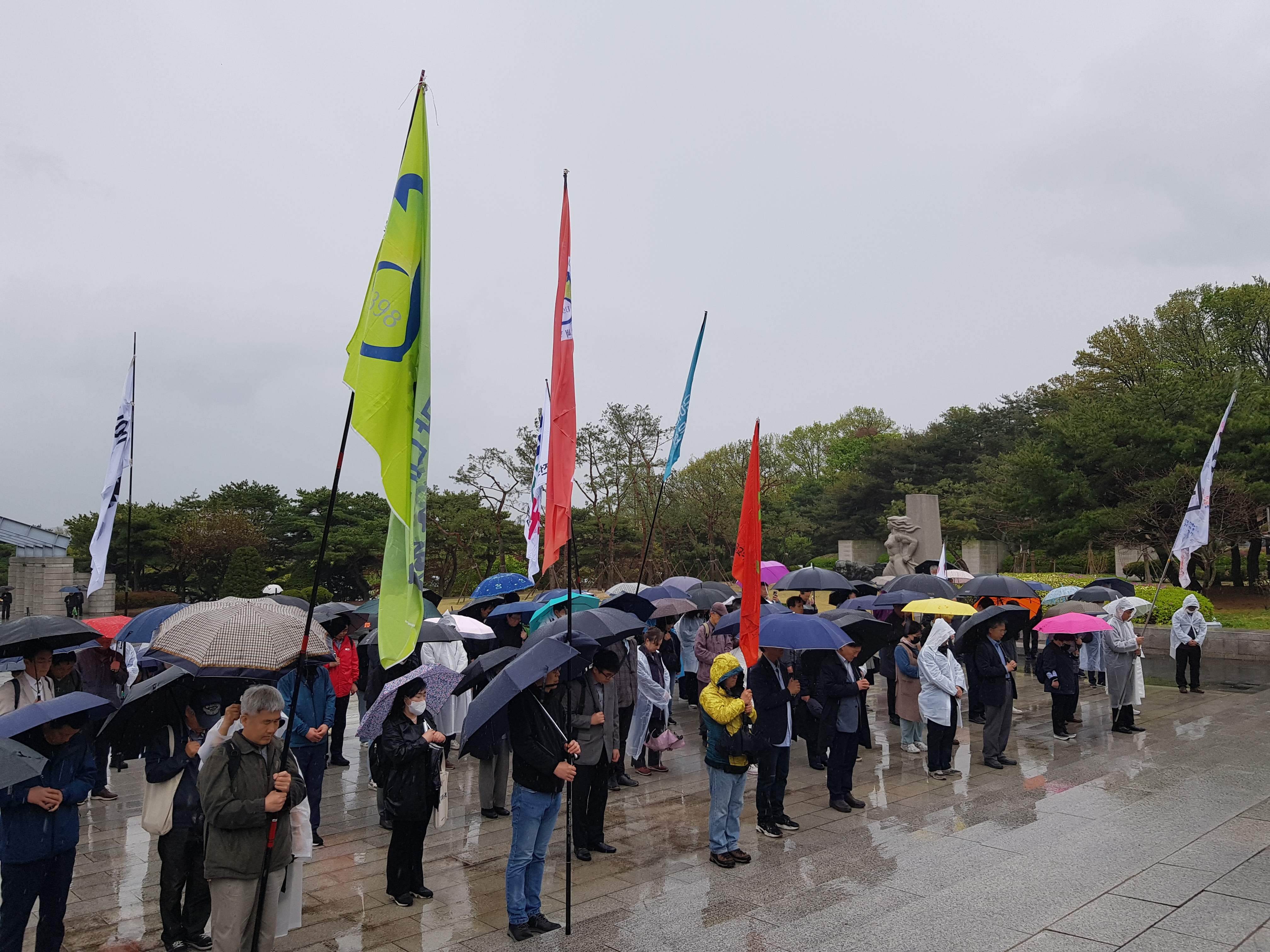 이 같은 결의와 열기가 증명하듯 이날 참배식장에는 성균관대 민주동문회, 한국외대 민주동문회, 경기중부지역비상시국회의, 언론비상시국회의, 성균관대 비상시국회의(추), 강북촛불행동, 강북민회, 6월민주항쟁계승사업회, 참교육동지회 등 참가단체의 깃발이 궂은 비를 아랑곳 앉고 솟아올라 현장을 메웠다.